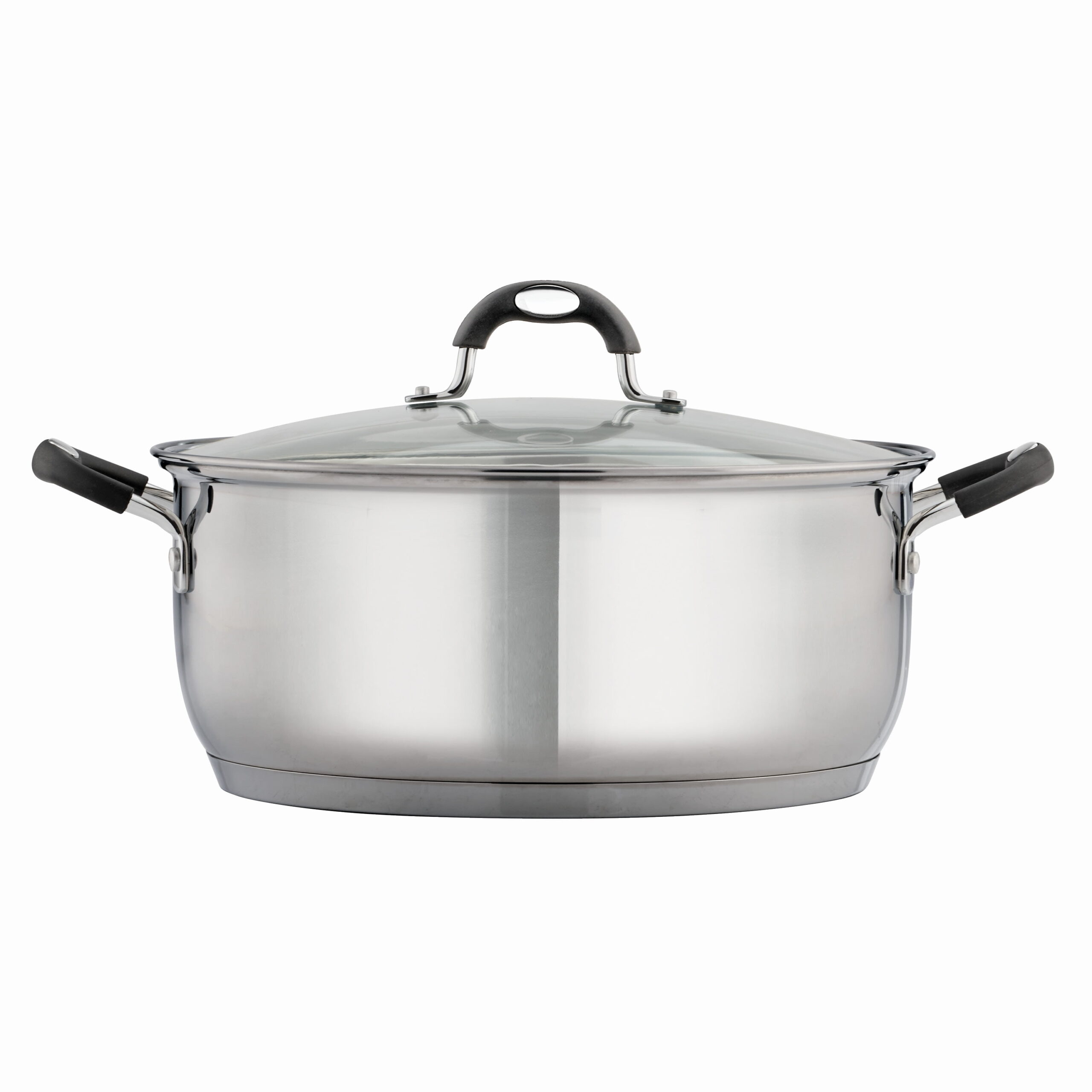 Tramontina’s Gourmet Stainless Steel 9 Qt. Covered Dutch Oven is a must have for making large batches of soups, stews and chili, boiling seafood, or slow-cooking large cuts of meat. The induction-ready tri-ply base distributes heat quickly and evenly, while the heat- and shatter-resistant glass lid allows you to monitor your cooking progress. Ergonomically designed, riveted, soft-grip silicone handles ensure a comfortable grip and provide added support when handling a filled pot.