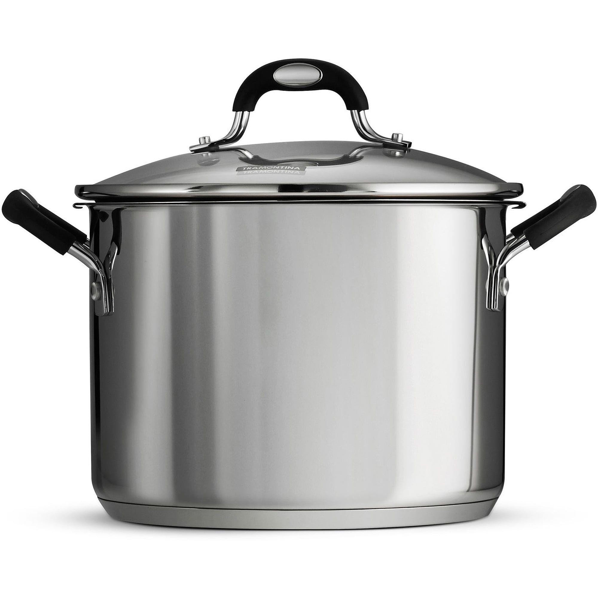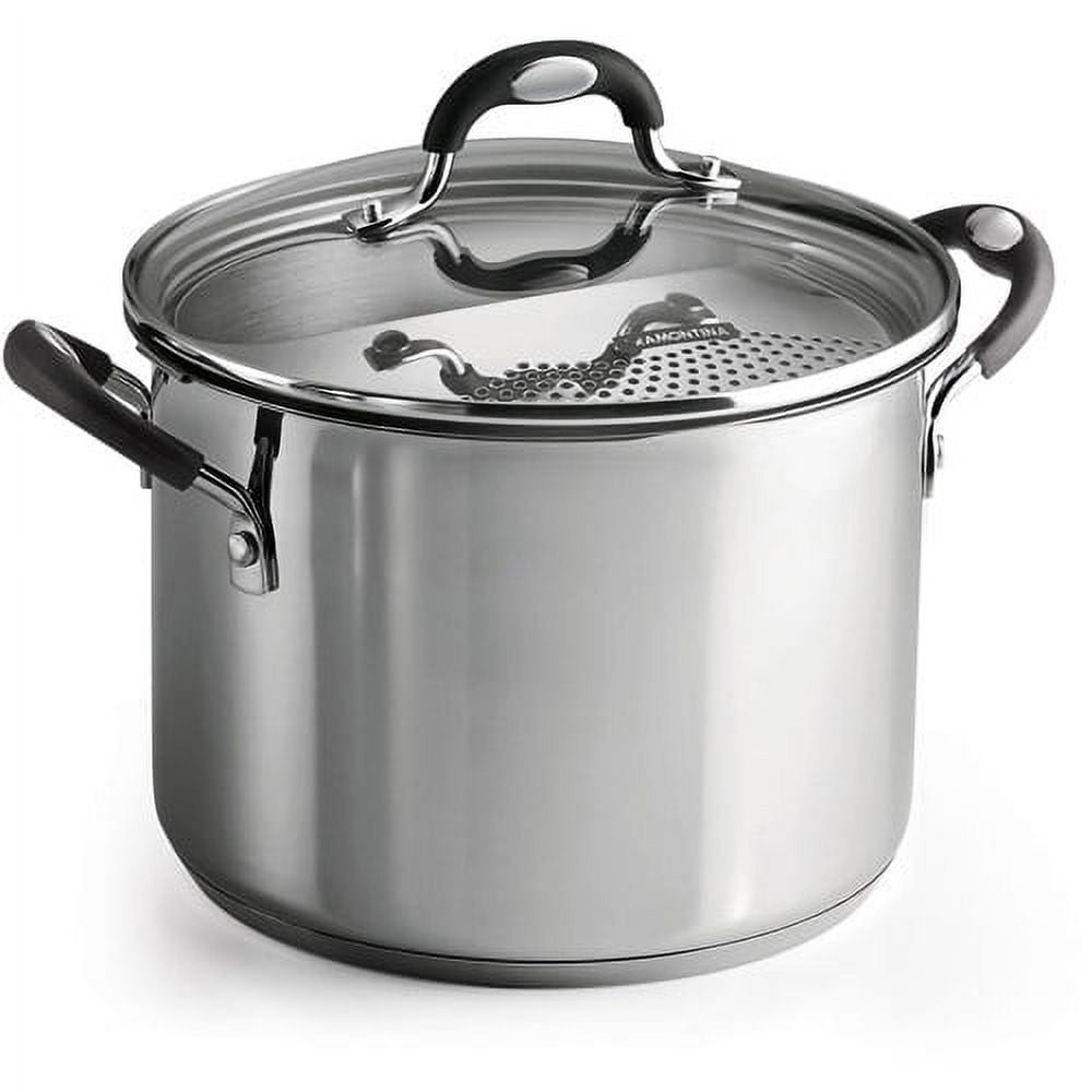 Superior heat conductivity and durability makes it ideal for preparing pasta, vegetables, stock, sauces and more Stainless-steel locking strainer assists with straining cooking water from pasta and vegetables Stainless-steel stockpot can be used with or without the locking strainer Tri-ply base construction ensures efficient, even heating Glass lid provides easy monitoring of cooking progress Ergonomic, soft-grip handles are riveted onto the stockpot for strength and durability Compatible with induction, electric, gas and ceramic cooktops Dishwasher Safe
