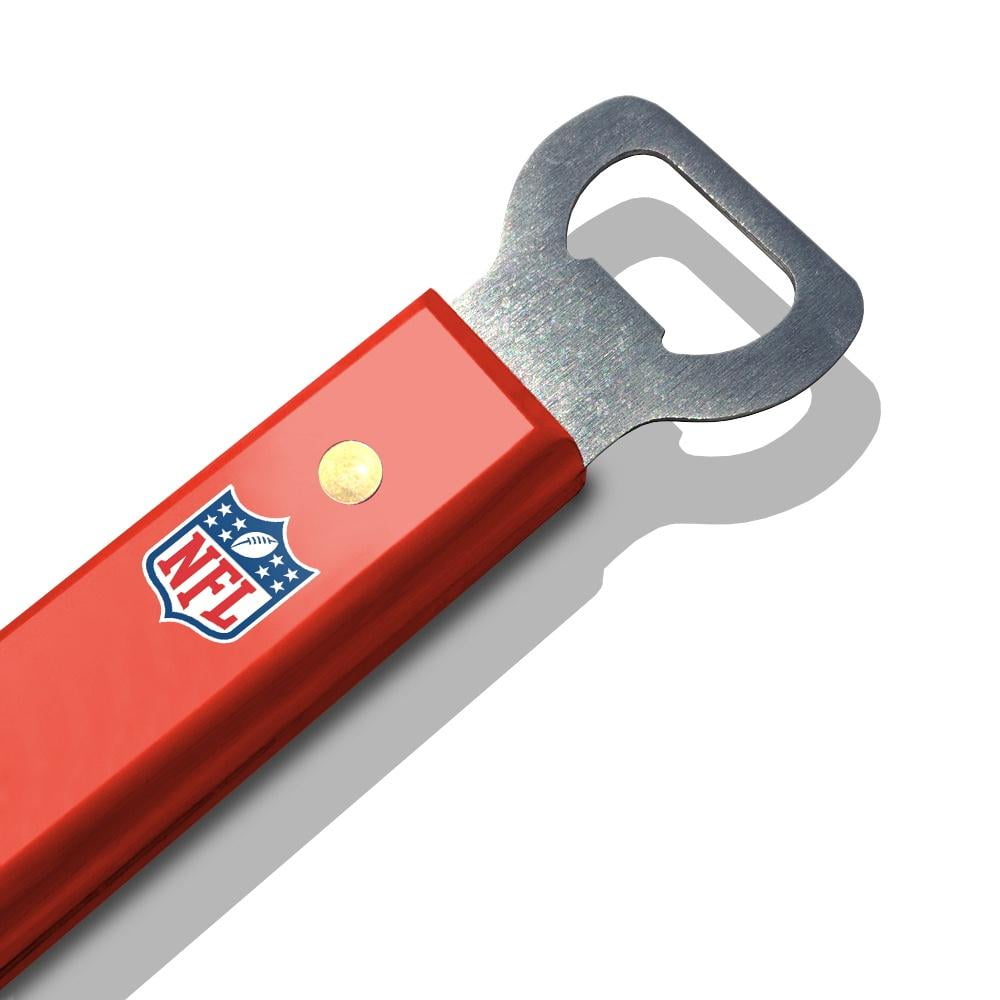 Get your grill game on with an officially licensed set of barbecue tools. The barbecue tool set includes a Sportula, a pair of tongs and a grill fork. Each tool is made from heavy-duty stainless steel with brass-riveted team colored composite handles. Your team’s logo is stamped on the team colored composite handles and the team logo is laser cut through the blade of the Sportula. The Sportula and the fork both come with an integrated bottle opener. An unforgettable gift for any fan and the most noticed accessory at any tailgating event.