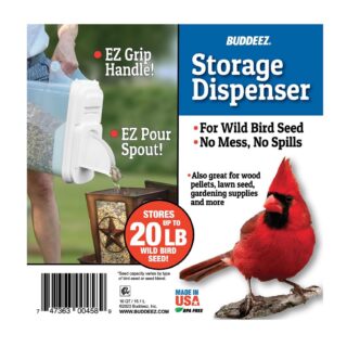 • The Buddeez bird food storage dispenser is the perfect storage solution for wild bird seed. The dispenser features a built in spout that allows neat and easy refills for all of your bird feeders. The lid also has an extra-wide flip top opening if you prefer to use a scoop. The stackable dispenser has a narrow shape to help maximize your storage space. The strong, ergonomically designed hand grips make it a breeze to lift and handle large bags of seed. Other great uses for this heavy duty storage dispenser include wood smoker pellets, lawn seed, gardening supplies and ice melt.