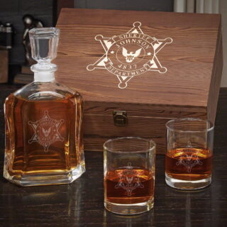 • Your local sheriff works hard to make sure that his county safe, and he deserves something nice that shows your appreciation! This personalized decanter set is one of the best sheriff gifts you can give. Included in this set is a handsome crystal decanter, two whiskey glasses, and a wooden gift box. Every piece in this entire set is personalized with a sheriff badge design featuring his name and badge number. He will be so proud to display this classy decanter set in his home! Whenever he’s had a long day, he will want to use his whiskey decanter set to enjoy a drink. These sheriff gifts are great for celebrating his anniversary, the holidays, or retirement. The Argos decanter measures 10.75″ x 5″ x 3″ and holds 23 ounces. The Eastham glasses each measure 4″ x 3.5″ and hold up to 10 ounces. The wooden gift box measures 12.25″ x 10″ x 5.5″. Liquor not included.