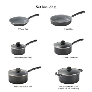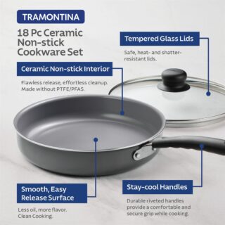 • Tramontina’s PrimaWare 18-Piece Nonstick Cookware Set provides all the cookware essentials and is an excellent starter cookware set. The patterned interior nonstick coating ensures easy cooking and simple cleanup, while the heat- and shatter-resistant tempered glass lids allow quick monitoring of cooking progress.