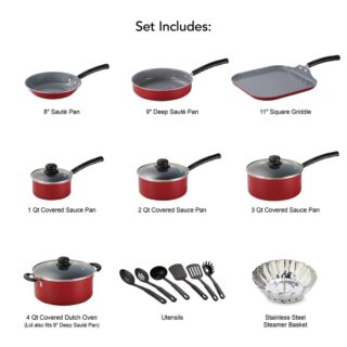 • Tramontina’s prima ware 18-piece nonstick cookware set provides all the cookware essentials and is an excellent starter set. The patterned interior nonstick coating ensures easy cooking and simple cleanup. Available in two colors, the dishwasher safe cookware set makes prepping meals for one to many a breeze. Coordinating utensils and pots make this collection both practical and functional. This aluminum cookware set is lightweight and can be used by any level meal preparation person. Stay-cool handles decrease the chance of burning yourself when you are preparing and see-through lids lets you keep close watch on progress. The Tramontina’s prima ware 18-piece nonstick cookware set works well with most range types.