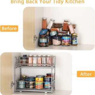• The 2-tier basket organizer is designed for convenience and allows for good storage and organization in just about any room in the house. The smooth-gliding drawer is convenient for storing and taking out items, and easily saves you cabinet space. The mesh design protects small accessories from falling. The 4 plastic feet at the base allows stability and prevents the organizer from moving or sliding. It can be placed in cabinets, countertops, kitchens, under sinks, dressing tables, work areas, etc. With 2 pull-out drawers, you can easily find everything. There are 4 positioning holes on the upper and lower sides. You can choose to adjust the height of the 2-tier baskets, so you can adjust the baskets according to the things you store.