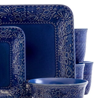 • Add a touch of elegance to your home with the Elama Indigo Lotus 16 Piece Square Stoneware Dinnerware Set. This plate collection is crafted from quality stoneware and colored in a clean Indigo for a stunning staple piece that’s durable and long-lasting. Each plate, bowl, and mug is laced with an intricate baroque design. Each dish in this set is dishwasher and microwave safe for easy cleaning and everyday use.Item Dimensions: 12.00″ x 12.00″ x 12.00″Item Weight: 23.95lbs Set: 16 Piece Dinnerware Material: Stoneware Color: Indigo Pattern: Embossed Floral Shape: Square Dishwasher Safe Microwave Safe Set Includes: Four 14″ Dinner Plates Four 10.5″ Dessert Plates Four 20oz. Bowls Four 10oz. Mugs Per Item Measurements: Dinner Plate: 14″ diameter, 10.5″ length, 10.5″ width, 1″ height, 2.35 lbs. weight Dessert Plate: 10.5″ diameter, 8″ length, 8″ width, 1″ height, 1.2 lbs. weight Bowl: 6″ diameter, 3″ height, 20oz. capacity, 1.10 lbs. weight Mug: 4″ diameter, 4.5″ height, 3″ handle, 10oz. capacity, 0.85 lb. weight