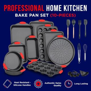 • The BAKKEN 10-piece Nonstick Carbon Steel Bakeware Set is the perfect addition to any kitchen, whether for home cooks or professionals. This set includes one baking pan measuring 17.32” x 12.6” x 1.96”, one pizza pan measuring 14.56” x 12.99” x 0.78”, one small cookie pan measuring 15.15” 10.03” 0.60”, two round pans both measuring 10.24” x 9.60” x 1.60”, a square pan measuring 10.82 8.74 1.85, one loaf pan measuring 11.69 5.94 2.55, one big cookie pan measuring 17.1” x 11.8” x 0.67”, twelve cup muffin pan all measuring 16.22” x 10.43” x 1.18”, and twenty-four cup muffin pan all measuring 16.92” x 10.62” x 0.98”. These pans are ideal for everything from baking cookies and croissants to roasting vegetables, ensuring even heat distribution thanks to their commercial-grade carbon steel construction. The sturdy design prevents warping, even at high temperatures, making them perfect for everyday use. The nonstick coating not only ensures that your baked goods slide right off but also makes cleanup a breeze, helping you save time in the kitchen. These pans are oven-safe up to 450F, providing ample temperature resistance for a wide variety of recipes. In addition to their high performance, these pans feature a space-saving, stackable design that allows for easy storage, making them perfect for both home kitchens and professional settings. Safe for use in the oven, refrigerator, and freezer, and free from harmful chemicals .This bakeware set provides a reliable solution for all your baking needs, ensuring that every meal is prepared safely.
