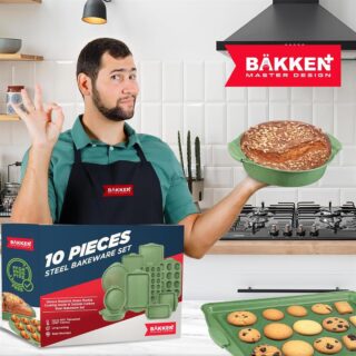 • The BAKKEN 10-piece Nonstick Carbon Steel Bakeware Set is the perfect addition to any kitchen, whether for home cooks or professionals. This set includes one baking pan measuring 17.32” x 12.6” x 1.96”, one pizza pan measuring 14.56” x 12.99” x 0.78”, one small cookie pan measuring 15.15” 10.03” 0.60”, two round pans both measuring 10.24” x 9.60” x 1.60”, a square pan measuring 10.82 8.74 1.85, one loaf pan measuring 11.69 5.94 2.55, one big cookie pan measuring 17.1” x 11.8” x 0.67”, twelve cup muffin pan all measuring 16.22” x 10.43” x 1.18”, and twenty-four cup muffin pan all measuring 16.92” x 10.62” x 0.98”. These pans are ideal for everything from baking cookies and croissants to roasting vegetables, ensuring even heat distribution thanks to their commercial-grade carbon steel construction. The sturdy design prevents warping, even at high temperatures, making them perfect for everyday use. The nonstick green coating not only ensures that your baked goods slide right off but also makes cleanup a breeze, helping you save time in the kitchen. These pans are oven-safe up to 450F, providing ample temperature resistance for a wide variety of recipes. In addition to their high performance, these pans feature a space-saving, stackable design that allows for easy storage, making them perfect for both home kitchens and professional settings. Safe for use in the oven, refrigerator, and freezer, and free from harmful chemicals .This bakeware set provides a reliable solution for all your baking needs, ensuring that every meal is prepared safely.