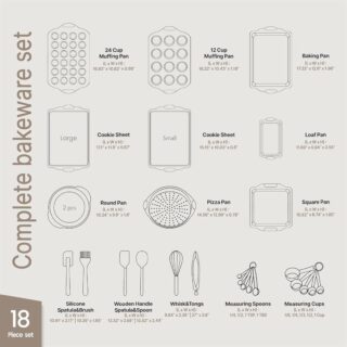 • The BAKKEN 18-piece Nonstick Carbon Steel Bakeware Set is the perfect addition to any kitchen, whether for home cooks or professionals. This set includes one baking pan measuring 17.32” x 12.6” x 1.96”, one pizza pan measuring 14.56” x 12.99” x 0.78”, one small cookie pan measuring 15.15” 10.03” 0.60”, two round pans both measuring 10.24” x 9.60” x 1.60”, a square pan measuring 10.82 8.74 1.85, one loaf pan measuring 11.69 5.94 2.55, one big cookie pan measuring 17.1” x 11.8” x 0.67”, twelve cup muffin pan all measuring 16.22” x 10.43” x 1.18”, twenty-four cup muffin pan all measuring 16.92” x 10.62” x 0.98”, wooden handle spoon, wooden handle spatula, measuring spoons measuring 1/4, 1/2, 1 tsp, 1 tbs, Measuring Cups with 1/8, 1/4, 1/3, 1/2, and 1 cup, a whisk, tongs, silicone spatula, and a silicone brush. These pans are ideal for everything from baking cookies and croissants to roasting vegetables, ensuring even heat distribution thanks to their commercial-grade carbon steel construction. The sturdy design prevents warping, even at high temperatures, making them perfect for everyday use. The nonstick coating not only ensures that your baked goods slide right off but also makes cleanup a breeze, helping you save time in the kitchen. These pans are oven-safe up to 450F, providing ample temperature resistance for a wide variety of recipes. In addition to their high performance, these pans feature a space-saving, stackable design that allows for easy storage, making them perfect for both home kitchens and professional settings. Safe for use in the oven, refrigerator, and freezer, and free from harmful chemicals. This bakeware set provides a reliable solution for all your baking needs, ensuring that every meal is prepared safely.