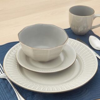 • Set your table with The Alix 16-piece dinnerware set. Let the classic design offers a chic update to a traditional dinnerware set. The textured details add an element of fashion perfect for inspiring conversation. The design is complemented by its durable stoneware composition, perfect for entertaining family and friends. Each set includes service for four including four dinner plates, four salad plates, four bowls, and four mugs. The Alix 16-piece dinnerware set is microwave safe for reheating, dishwather safe, stoneware material, round shape. Size 11″ Dinner Plate, 7.25″ Salad Plate, 5.75″ Bowl, Mug 11.4oz