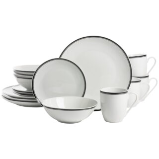 $42.78Add to cartClassic, clean, and durable, the Simply Coupe collection sports a seamless shape and a double banded rim decal in a variety of stylish shades. Made with oven-to-table, microwave, and dishwasher safe porcelain these dishes will be your go-to for breakfast, lunch, dinner, and snacks in between. This 10 Strawberry Street Black 16-Piece Dinnerware Set serves four and includes: 4 dinner plates, 4 salad plates, 4 soup bowls and 4 mugs.