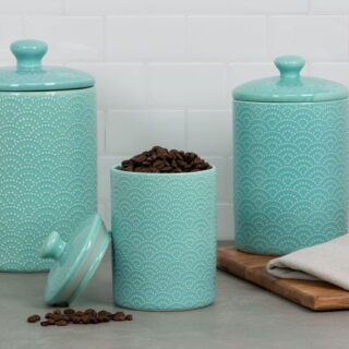 $39.62Add to cartDecorative and functional, this stylish 3-piece canister set features an embossed texture, and a ceramic lid with a gasket seal, making them perfect for storing your countertop staples like flour, sugar, coffee, or tea.