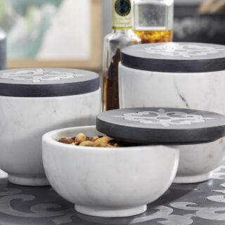 $51.06Add to cartOur new metal-inlay collection is washed with a translucent stain to create beautiful dark gray tones that compliment all neutrals, woods and decors. Our white-with-neutral tones marble large canister with lid can be used in any room of the home – it is food safe for the kitchen, and also looks lovely in the office or bath for organization.
