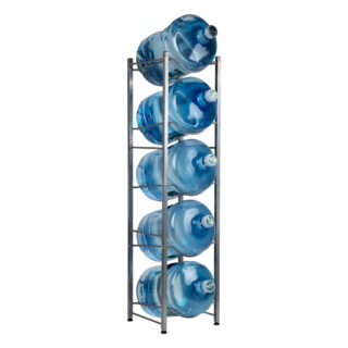• Convenient 5-Tier Water Jug Stand for Storage and Organization Keep your pantry, office kitchen, storeroom, or professional kitchen organized with this 5-tier heavy-duty water jug stand from the Alloy Collection. Designed to hold 5 full water jugs horizontally for equal weight distribution, this stand features metal beams that complement most water jug shapes. The gray metal construction blends seamlessly with other kitchen appliances and hardware, and it’s easy to clean with warm soapy water on a soft cloth. The stand requires assembly, but all necessary hardware and assembly instructions are included. This water jug stand makes an excellent addition to any office or new homeowner’s storage solutions.