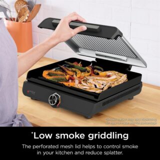 • Meet the Ninja Sizzle Indoor Griddle, the compact indoor griddle that sizzles your favorite meals right from your countertop. Cook various griddled creations that satisfy any craving, from fried eggs and crispy bacon to cheesesteaks and sizzling fajita, prepare griddled meals that the whole family will enjoy. The Ninja Sizzle Indoor griddle comes with a 14 Nonstick Griddle Plate at 1450 watts. Delivers precision with edge-to-edge even cooking and up to 500F high-heat searing. Its family-sized 14-inch nonstick griddle plate is perfect for making multiple dishes at once, and cleanup is hassle-free with a removable, dishwasher-safe plate and grease catch.