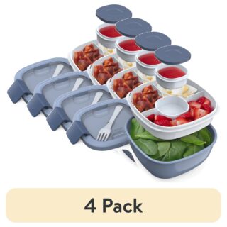 • The bentgo Salad all-in-one salad container makes eating fresh and healthy salads while on the go easier than ever. The all-in-one design offers a perfect solution for mess-free transport of your greens, salad toppings, and salad dressing, so you can enjoy a delicious and nutritious salad at school, at work, on a plane, at the park, or just about anywhere. All the components of the bentgo Salad container stack conveniently inside the large salad bowl for easy portability. All-in-one container makes eating fresh and healthy salads while on the go easier than ever. Dimensions: 4.15″H x 7.2″W x 7″D. Made with quality food-grade, FDA approved materials that contain no BPA, vinyl, lead, or PVC; comes in a slate color. Airtight lid designed with a sealing ring and locking clips for fresh and secure travel. Lid’s Tritan cutlery cover keeps the reusable fork sanitary during travel and has enough room to hold a paper napkin. Five different compartments keep everything separate until you’re ready to mix and eat. Large salad bowl easily holds up to 4 cups of greens, pasta or fruit, making it the perfect size for even the hungriest appetites. Salad bowl capacity: 54 oz.; sauce container capacity is 3 oz. With one 10 oz. compartment and two 5 oz. compartments, the compartment tray can be easily configured to hold three or more salad toppings or snacks. All the components of the container stack conveniently inside the large salad bowl for easy portability. Dishwasher-friendly (top shelf), making eating and cleanup a breeze. Sold as 1 Each.
